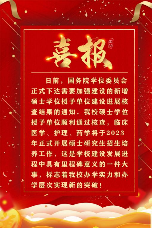 近日,据国务院学位委员会办公室下发的《关于下达需要加强建设的新增博士、硕士学位授予单位建设进展核查结果的通知》,公司顺利通过了国务院学位委员会核查,临床医学、护理与药学3个硕士专业学位授权点从2023年起开展招生和培养工作。这是公司团队建设工作的重大突破,是公司事业发展的标志性成果、历史性成就。