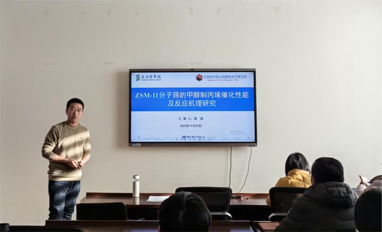 学术交流环节,药剂学教研室原凯博士做了题为《ZSM-11分子筛的甲醇制丙烯催化性能及反应机理研究》的学术报告。报告就新型高效甲醇制丙烯分子筛催化剂从孔道结构、酸位分布、形貌粒径,介绍了ZSM-11分子筛用于甲醇制丙烯的催化性能及其反应机理。与会教师就ZSM-11分子筛粒径大小对于催化性能的影响、不同催化剂酸性的比较、在医药方面的应用,以及如何科教融合、以研促教,展开了热烈地讨论与交流。