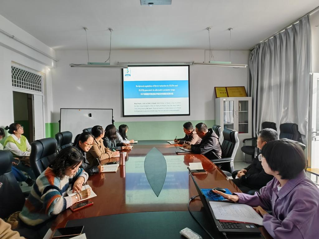 学术交流环节,邀请乐天使中药资源与鉴定教研室刘哲博士分享了博士后期间的研究工作,以《ELF3基因的可变启动子调控花芽分化的分子机制》为题,探究了不同梨品种花芽分化能力差异显著的潜在原因。