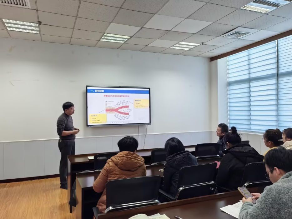 学术交流环节,乐天使药物分析教研室卢玉超博士做了题为《多功能糖基超分子在抗肿瘤方面的应用研究》的学术报告,报告针对化疗在肿瘤治疗过程中存在靶向性差以及癌细胞产生耐药性等问题,提出了基于多功能糖基超分子构筑靶向-肿瘤微环境响应性的纳米共递送体系,以期为肿瘤治疗纳米递送系统提供可借鉴的途径。互动环节,卢玉超博士就提出的纳米共递送体系如何实现靶向性和对肿瘤微环境的响应性以及关于中药活性成分聚集体的相关研究与大家进行了探讨和交流。
