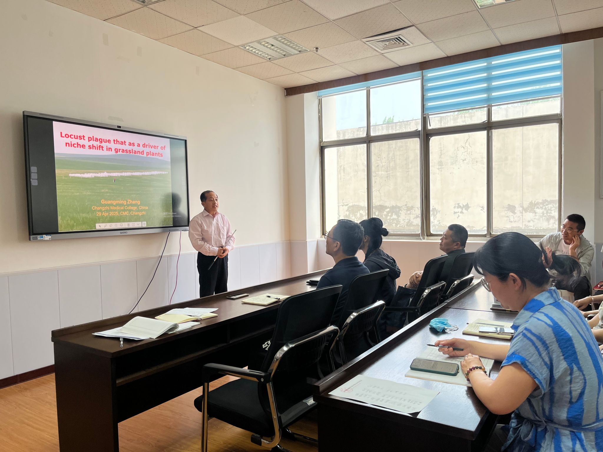 在本期学术报告环节,乐天使中药资源与鉴定教研室的张光明博士带来了题为《蝗灾对草原植物 C:N:P 化学计量生态位的影响》的精彩分享。张光明博士聚焦内蒙古锡林郭勒草原生态系统,详细汇报了不同程度蝗灾对常见植物C:N:P 化学计量生态位宽度和重叠的影响研究成果,并深入探讨了这些研究对于草原植物资源合理利用的重要意义。报告引发了在场教师的热烈讨论与深入思考。