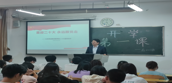 伴随着秋日的骄阳,沐浴着喜迎二十大的秋风,9月6日上午,宋晓亮副董事长在4号楼26教为联系班级药学系药2101班的同学们,以“喜迎二十大,永远跟党走”为主题讲授了“开学第一课”。